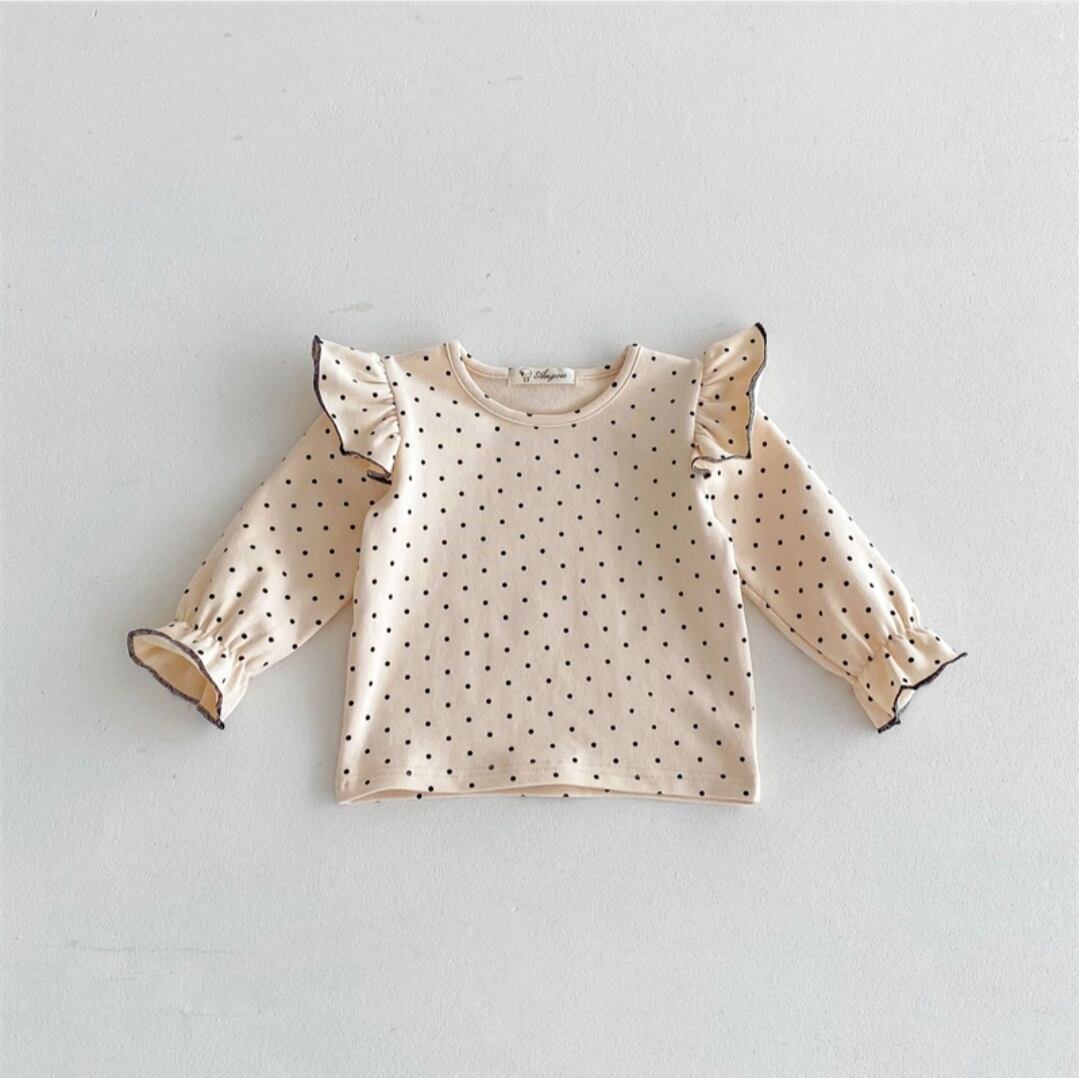 肩のフリルが魅力的な長袖Tシャツです!優れたデザインが特徴で、カジュアルなスタイルに合わせやすいアイテムとなっております。柔らかい素材感が心地よい着心地を提供し、日常の動きやすさも考慮された一着です。