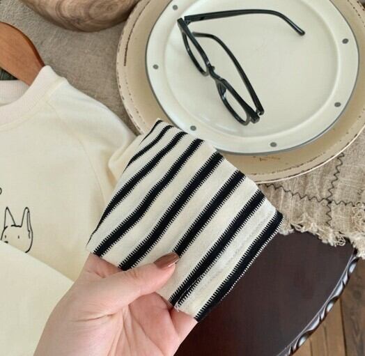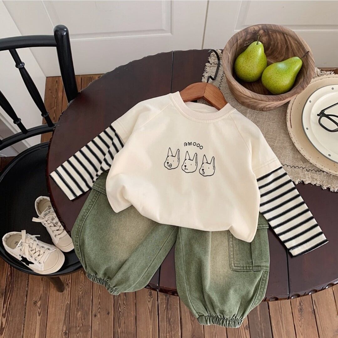 ユニークなドッグプリントが特徴で、カジュアルなお出かけや日常のコーディネートにぴったりなアイテムで、重ね着風デザインが楽しめます。