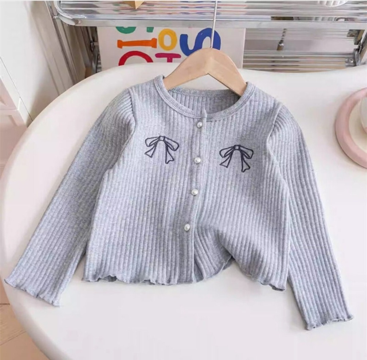 リボン柄リブカーディガン